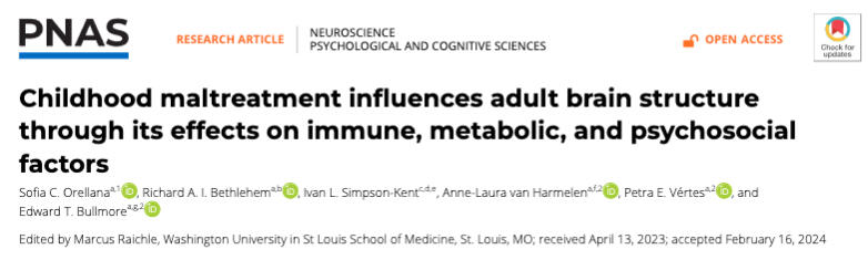 Childhood maltreatment influences adult brain structure through its effects on immune, metabolic and psychosocial factors; by Sofia C. Orellana, Richard A.I. Bethlehem, Ivan Simpson-Kent, Anne-Laura van Harmelen, Petra E. Vértes and Edward Bullmore. Proceedings of the National Academy of Sciences. (2024)
